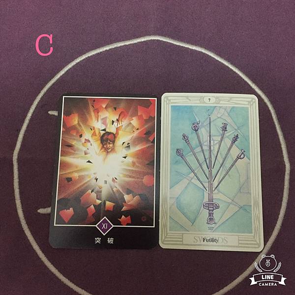 C.選到C的你,你經歷著重複出現的舊有模式,讓你覺得很累,不停掙扎也是徒勞無功,努力沒有意義只是浪費力氣,可是,你覺得這一切都夠了!不想再這樣下去!你想突破這一切舊有模式!親愛的,請你創造自己的肯定句,把你想聽到的話說給自己聽,重塑潛意識信念,創造新的模式。